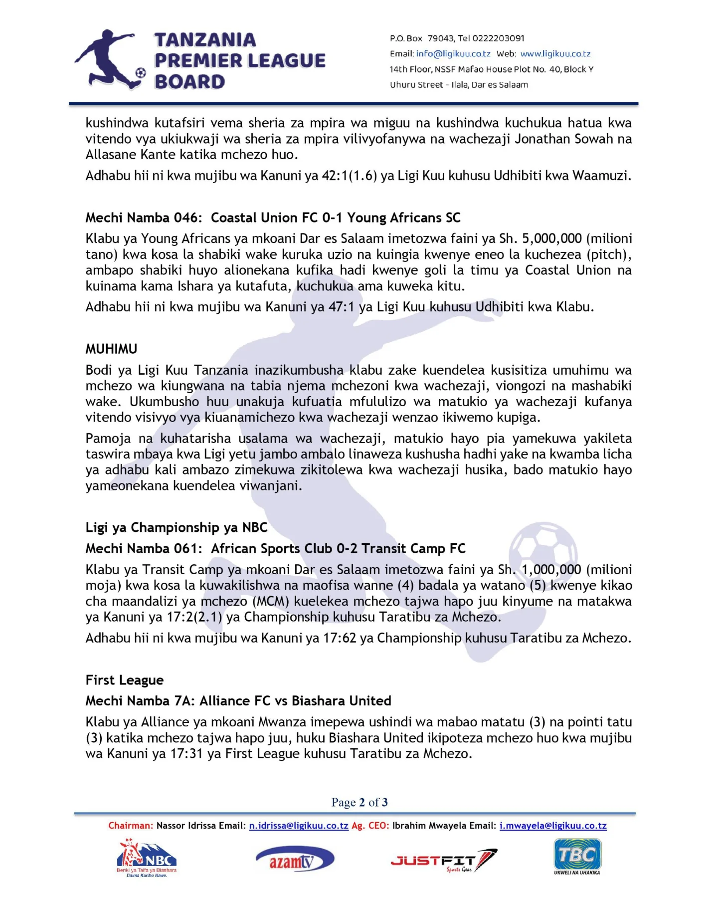“Adhabu hizi zinatolewa ili kutuma ujumbe wazi kuwa vitendo vya ukiukwaji wa sheria za mpira vya aina hii havikubaliwa na vinapewa kadhia,” ilieleza taarifa ya Ligi Kuu.