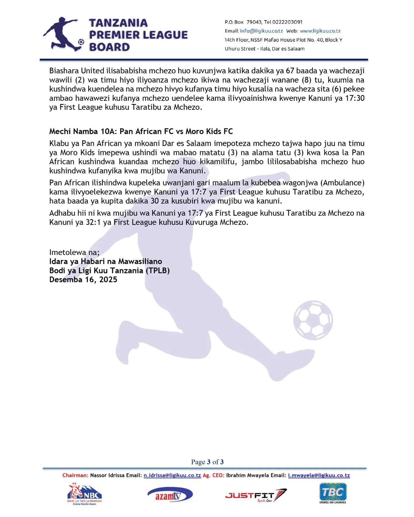 BODI ya Ligi Kuu ya Tanzania imetangaza adhabu kali kwa wachezaji wa klabu ya Simba SC, Jonathan Sowah na Allasane Kante, pamoja na mwamuzi Abdallah Mwinyimkuu, baada ya tukio la ukiukwaji wa kanuni kwenye mchezo dhidi ya Azam FC.